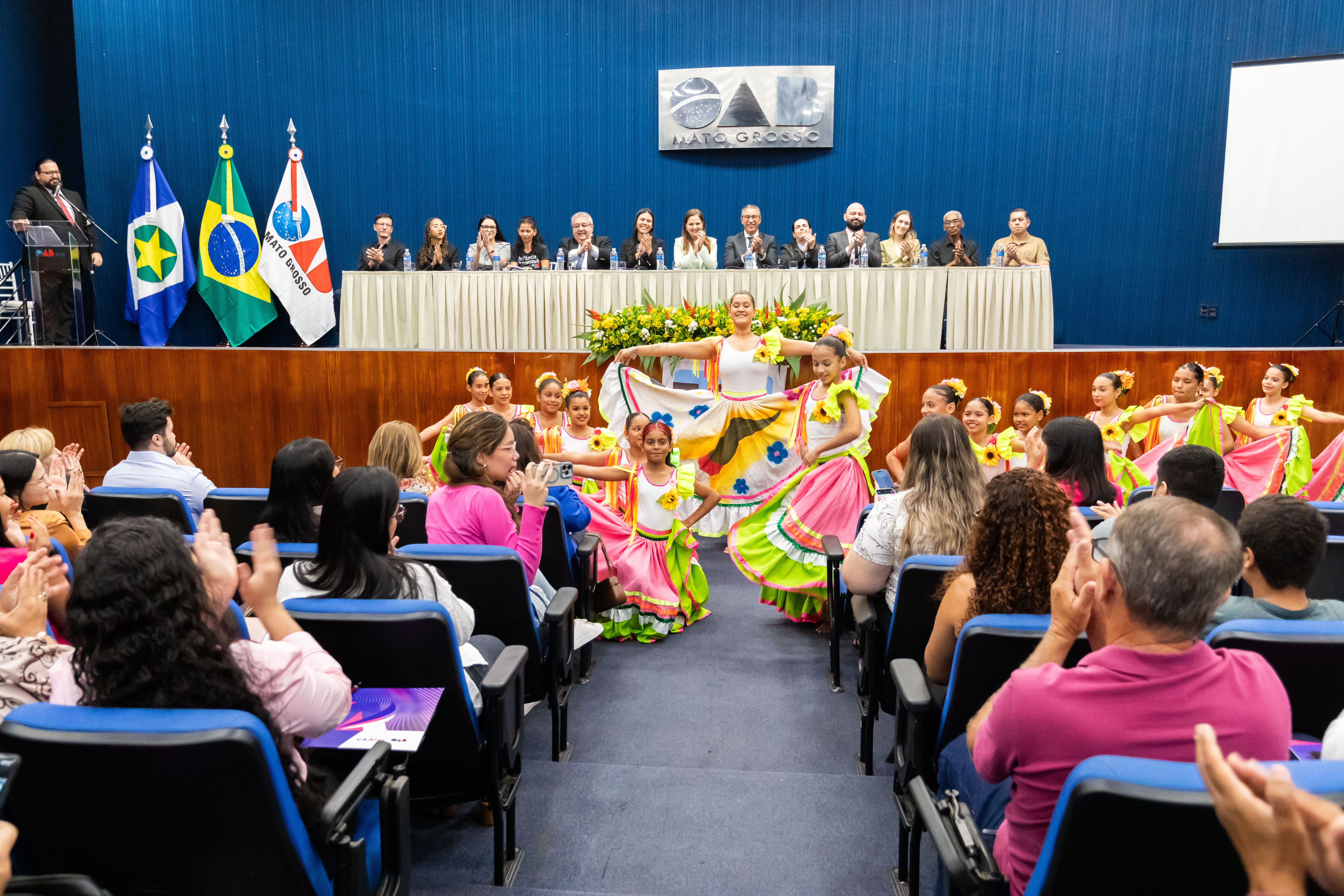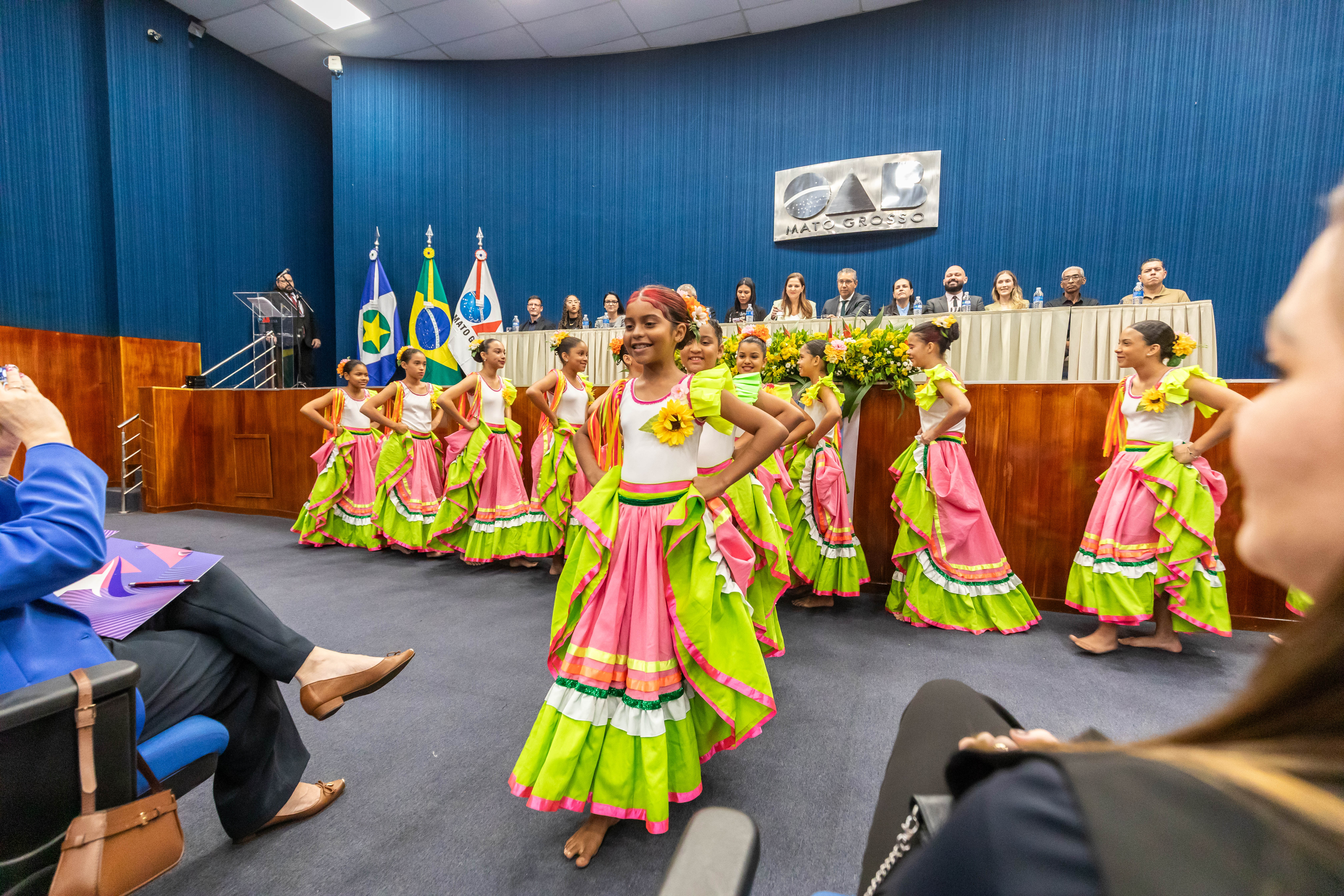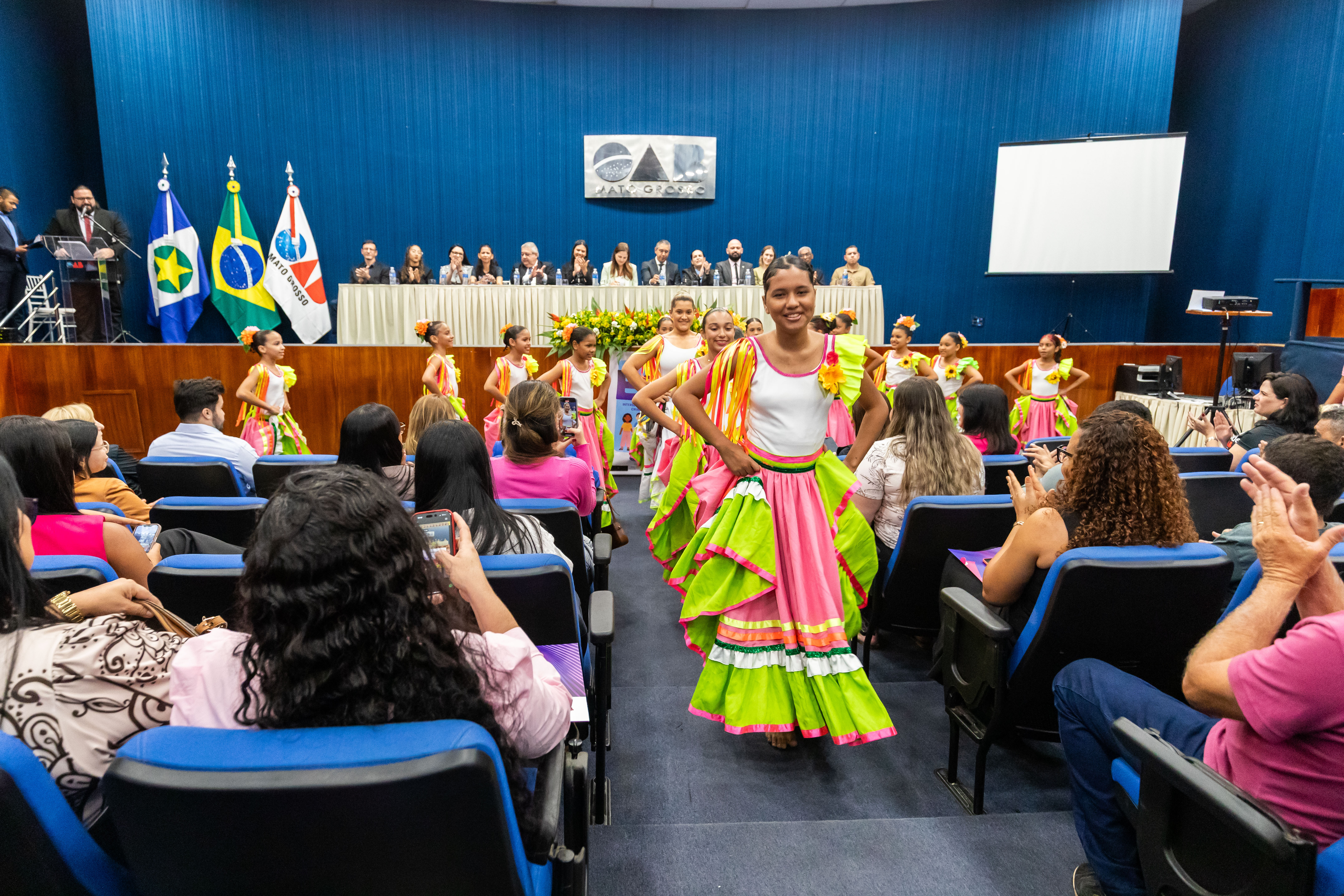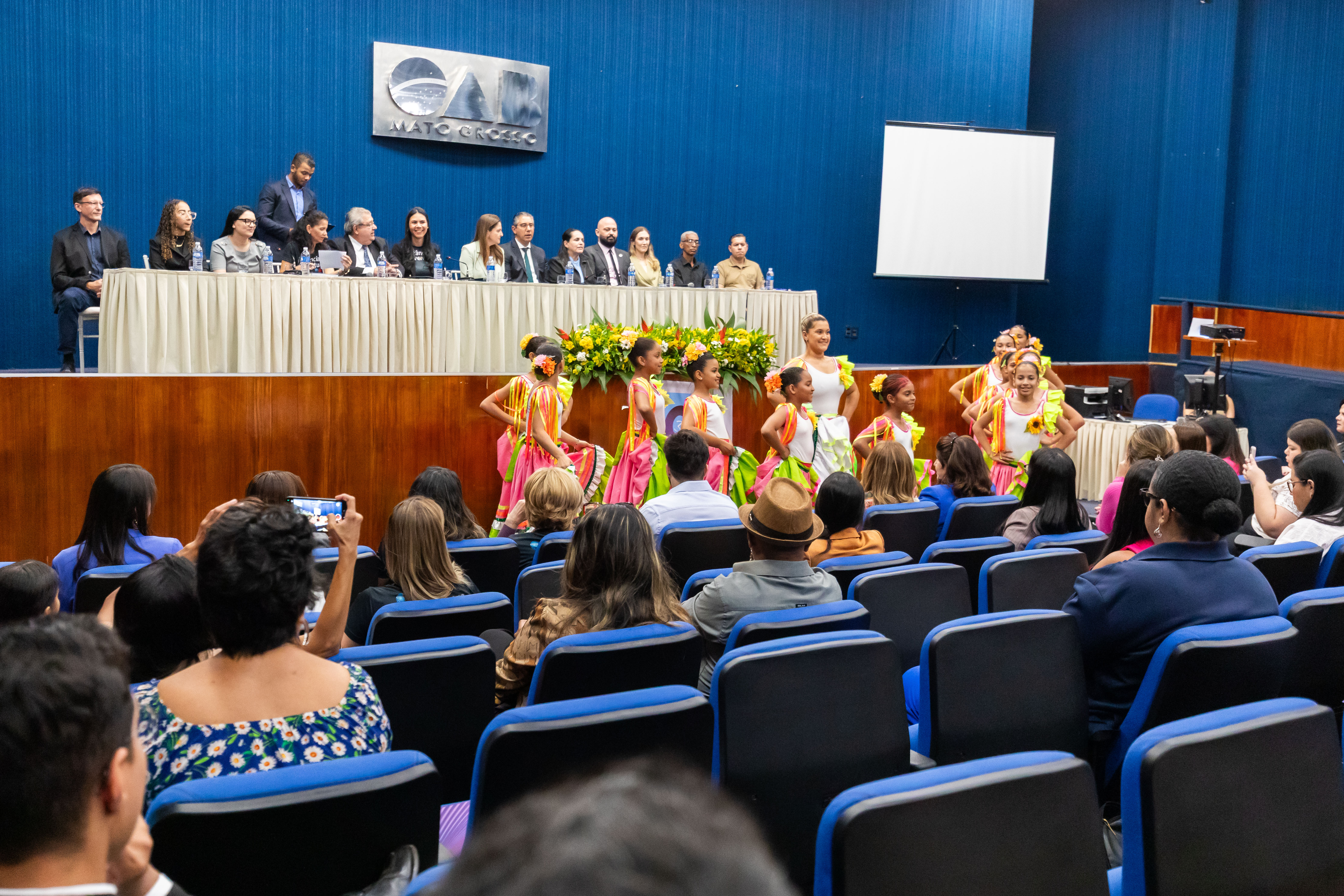 A imagem mostra as alunas do Programa Siminina, da unidade do bairro Três Barras, se apresentando no evento de comemoração dos 35 anos do ECA, promovido pela OAB-MT.