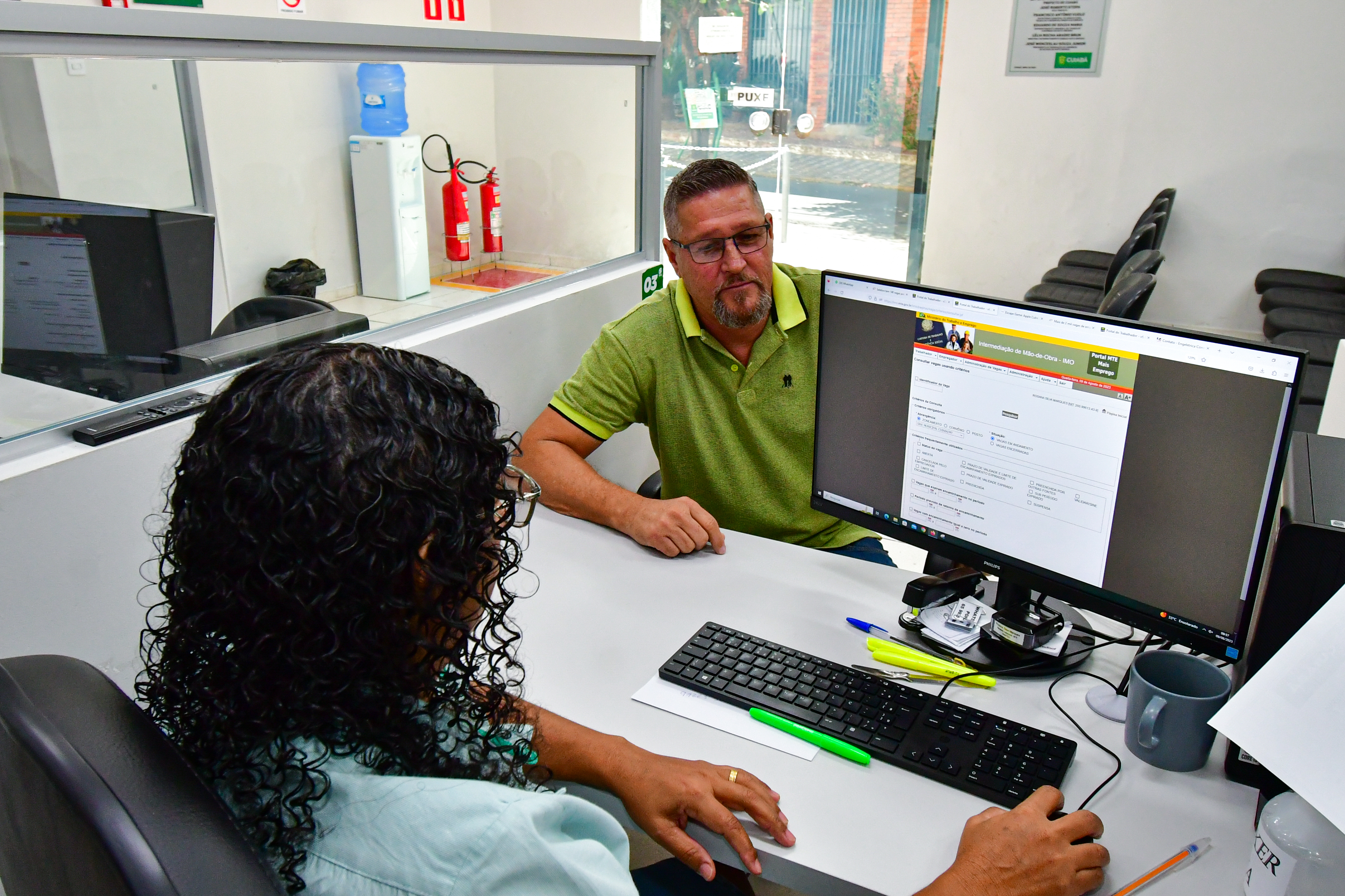 A foto mostra um cidadão sendo atendido pela funcionária do Sine Municipal. Ele parece interessado nas informações que ela tem na tela do computador.