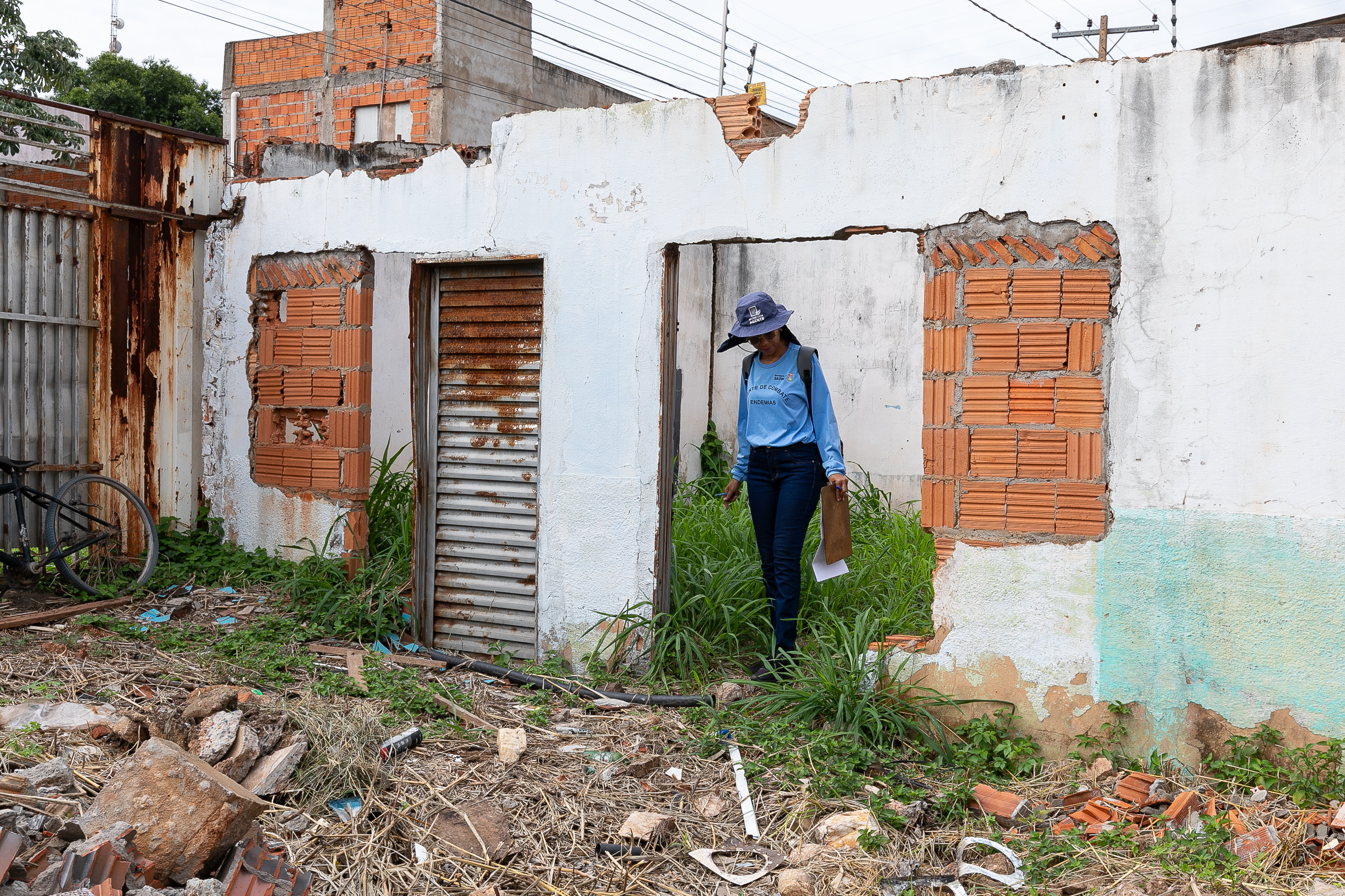 A imagem ilustra três agentes de saúde uniformizados realizando uma vistoria em um terreno baldio no bairro Jardim Florianópolis. A ação faz parte de um mutirão que visa fiscalizar e eliminar possíveis criadouros do mosquito Aedes aegypti, transmissor das doenças dengue, zika e chikungunya.