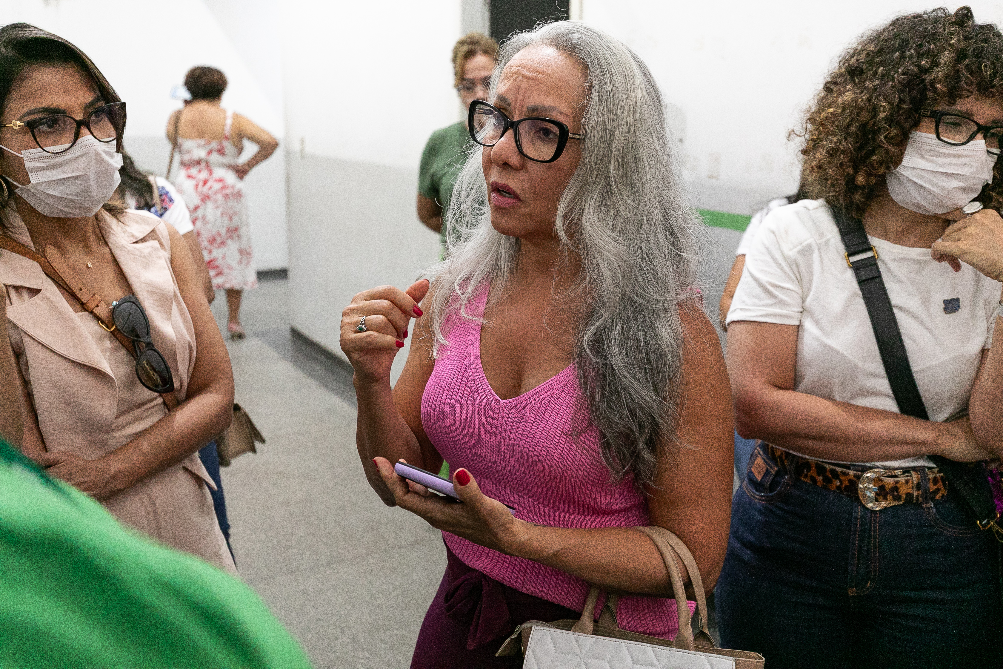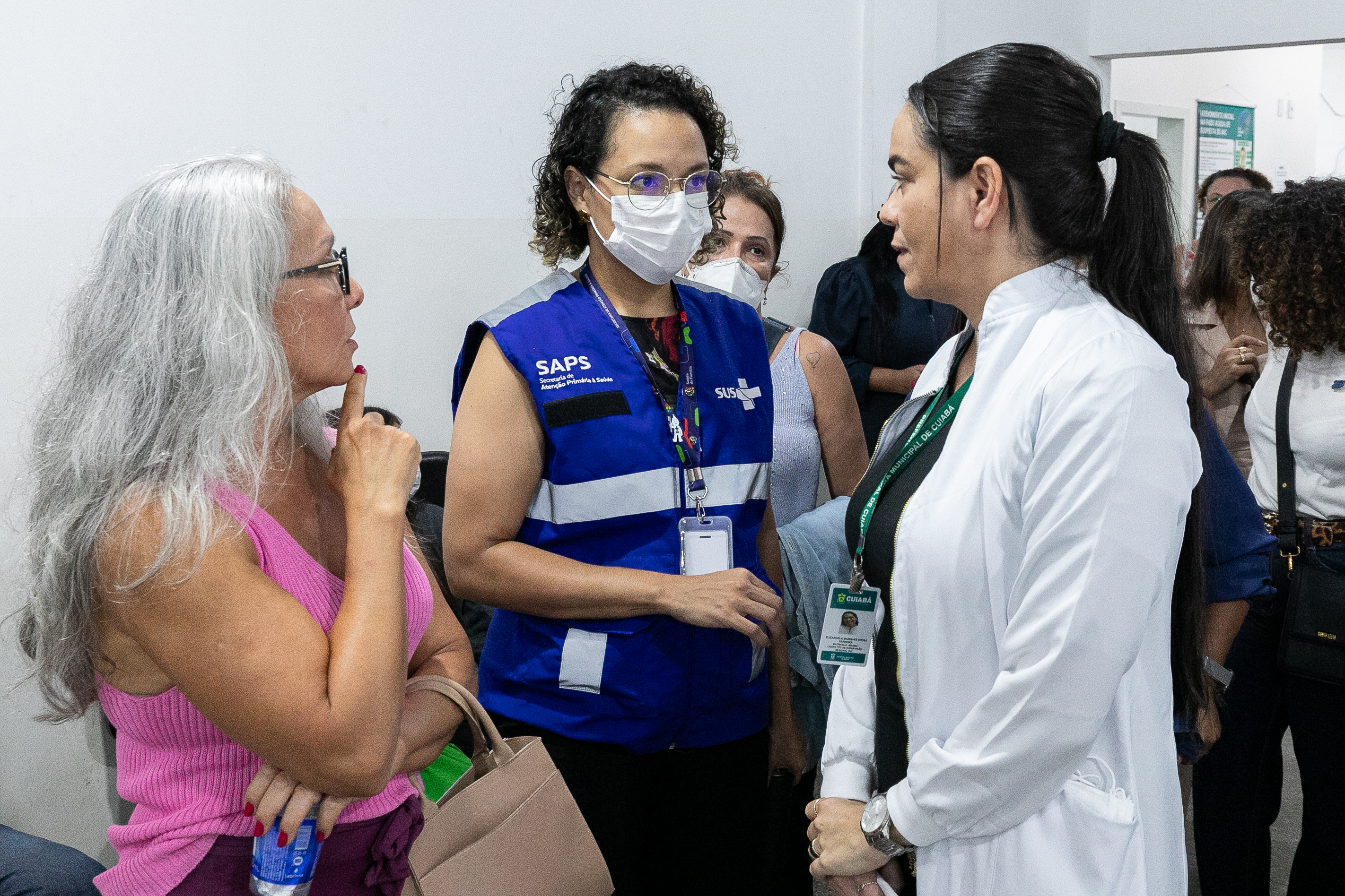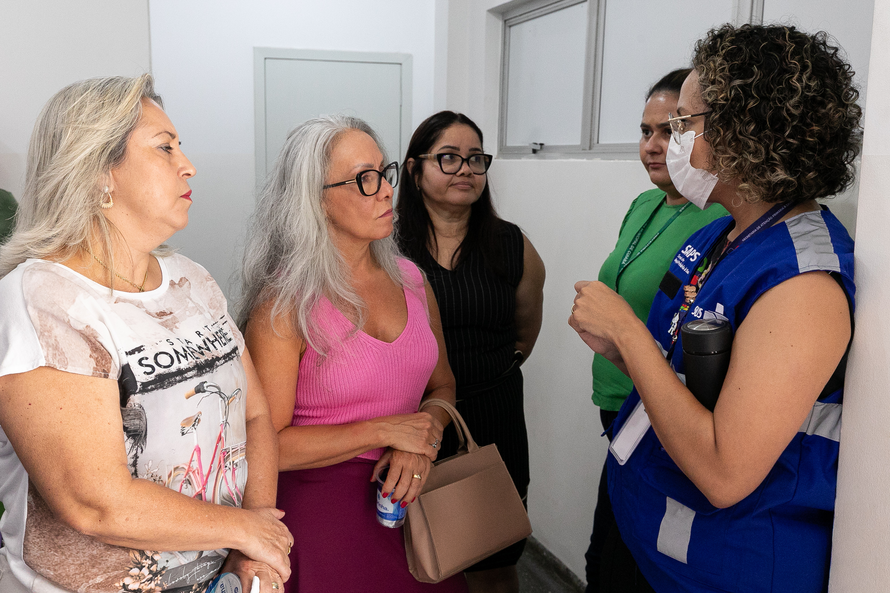 A imagem mostra quatro mulheres, sendo uma delas a secretária Lúcia Helena, de blusa rosa e cabelos brancos. Elas conversam durante vistoria em unidades de saúde da capital.