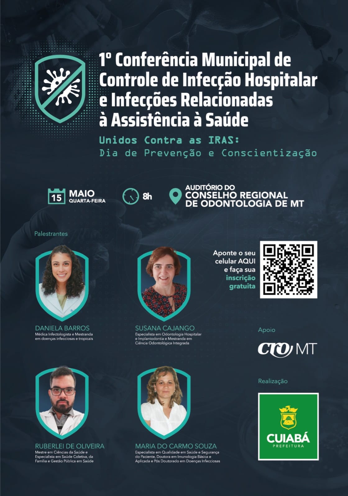 O evento acontece nesta quarta-feira (15), a partir das 8h, no auditório do Conselho Regional de Odontologia de Mato Grosso e contará com palestras de especialistas da área. Sendo eles: a médica Daniela Barros, que é infectologista e mestranda em Doenças Infecciosas e Tropicais; a cirurgiã-dentista Suzana Cajango, que é especialista em Gestão Pública e Administração Hospitalar, Saúde Coletiva e da Família, com habilitação em Odontologia Hospitalar e Implantodontia; o farmacêutico Ruberlei Godinho, que é mestre em Ciências da Saúde na área de Farmacologia, doutor em Biotecnologia e pós-doutor (PhD) em Microbiologia/Biologia Molecular; e a bióloga Maria do Carmo Souza, que é especialista em Qualidade em Saúde e Segurança do Paciente, Qualidade e Segurança no Cuidado, mestre em Ciências da Saúde na área de Farmacologia e doutora em Imunologia Básica e Aplicada.