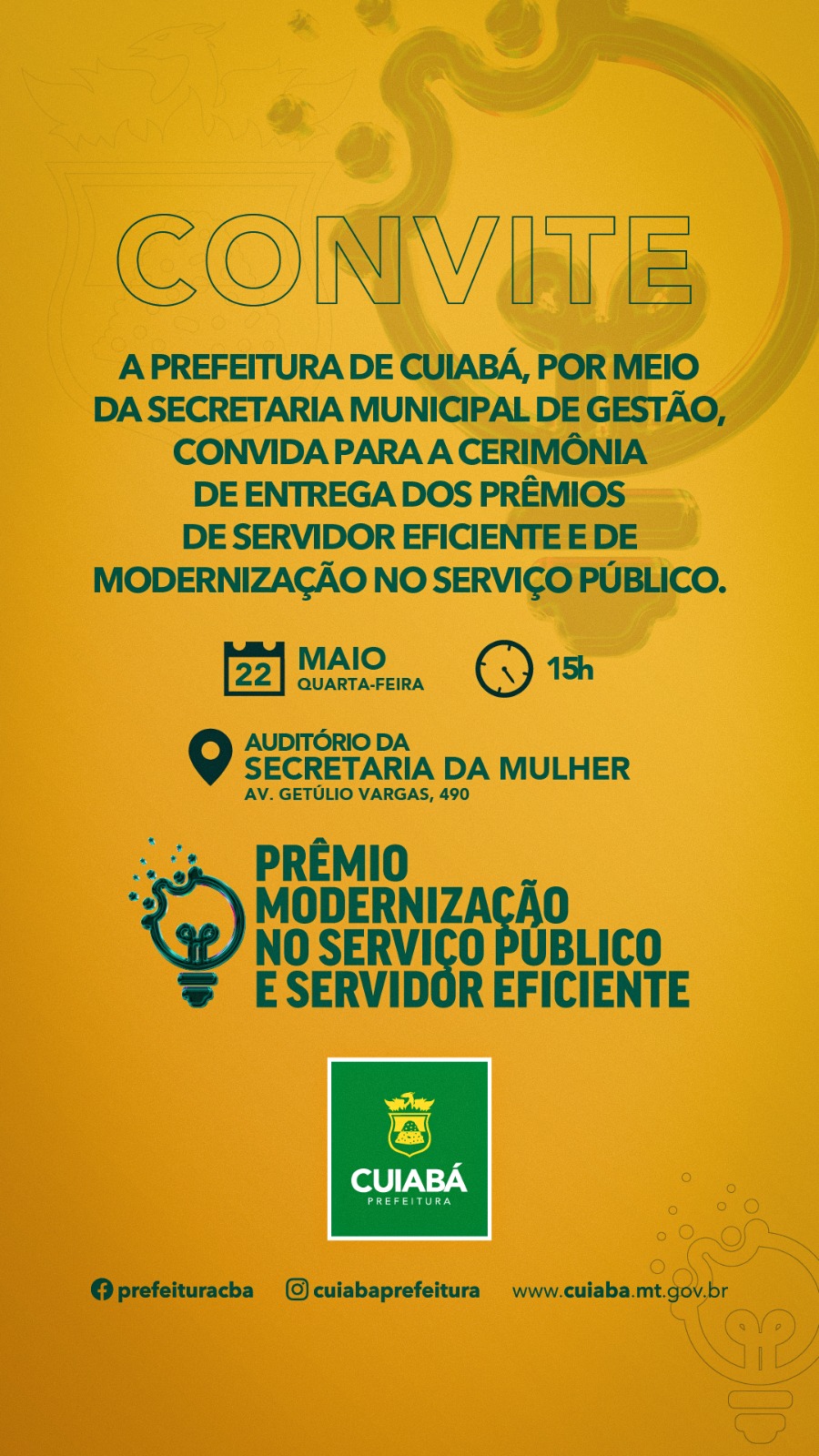 A Prefeitura de Cuiabá, por meio da Secretaria Municipal de Gestão, convida para a cerimônia de entrega dos prêmios de Servidor Eficiente e Modernização do Serviço Público, na tarde desta quarta-feira (22). O evento está marcado para acontecer às 15h no auditório da Secretaria da Mulher.
