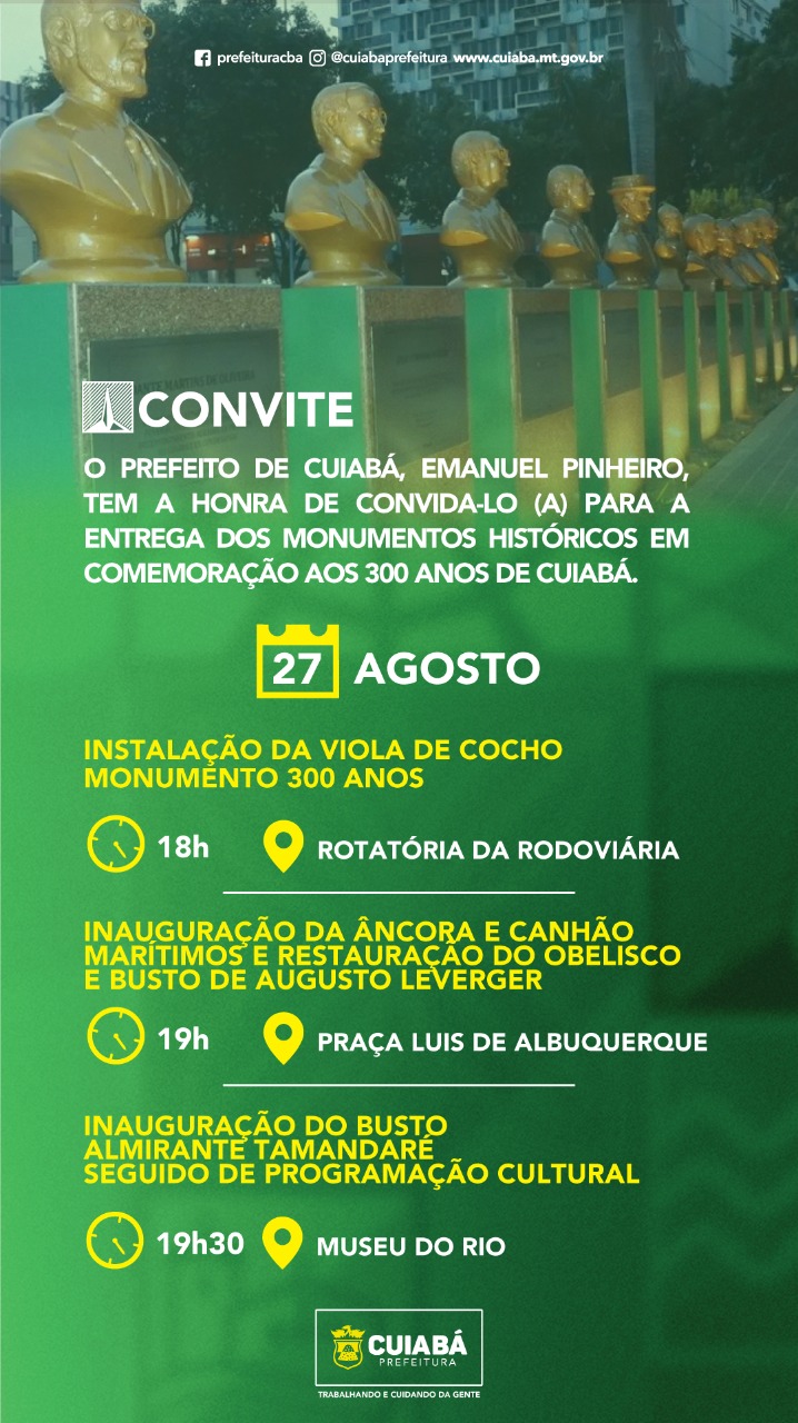 A Prefeitura de Cuiabá, por meio da Secretaria de Cultura, Esporte e Turismo, entrega na tarde desta terça-feira (27), às 18h, na rotatória do Terminal Rodoviário de Cuiabá, um monumento histórico em formato de viola de cocho em homenagem a conexão de Cuiabá com a “Cidade Branca”, Corumbá, (MS). Em seguida, às 19h, acontece a entrega do busto restaurado de Augusto Leverger e o Obelisco na Praça Luís de Albuquerque e do busto do Almirante Tamandaré no Museu do Rio.