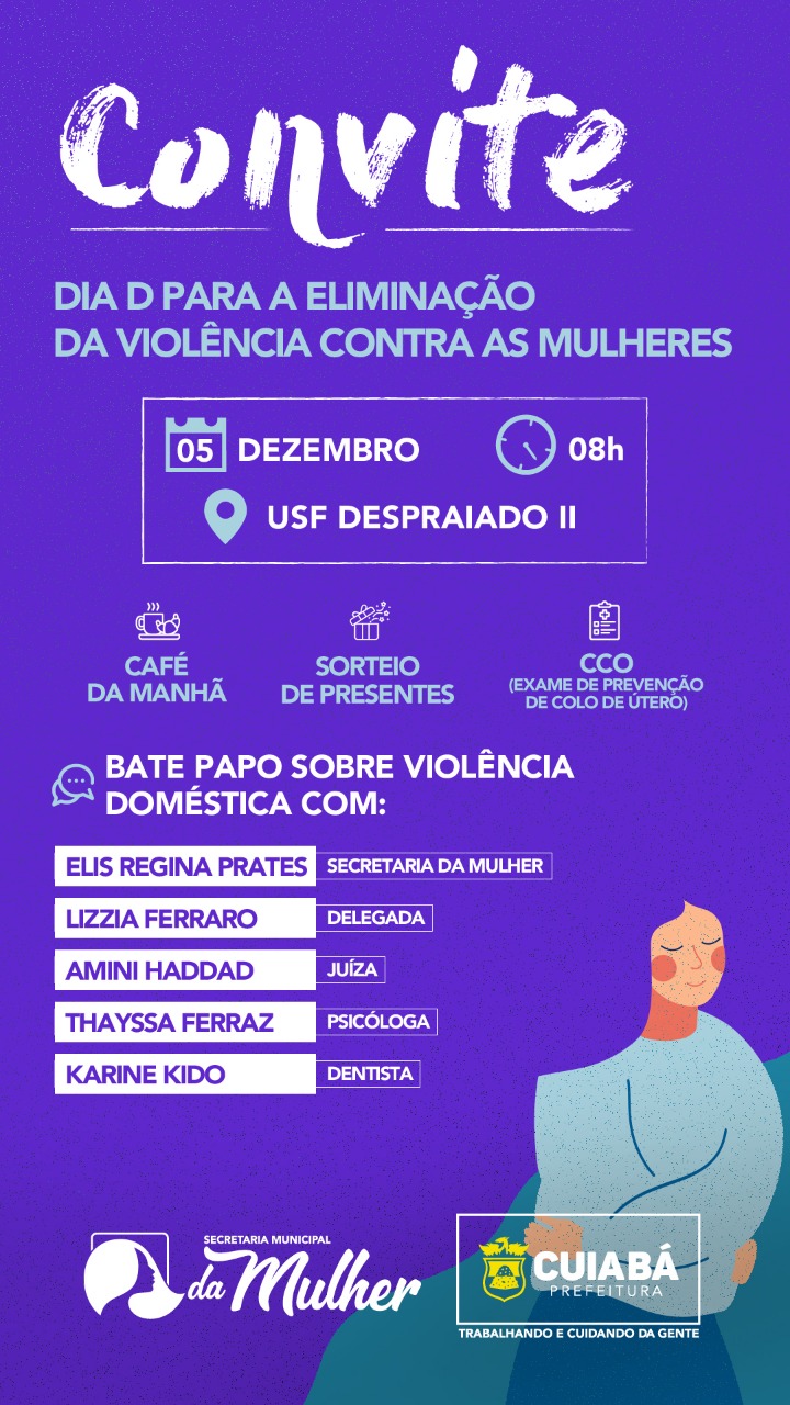 Domingo é dia D para a eliminação da violência contra as mulheres com a comunidade do Despraiado II. A Secretaria da Mulher promove neste sábado (05), a partir das 8h, um bate-papo sobre violência doméstica. O encontro acontece na Unidade de Saúde da Família (USF) do bairro e é aberto ao público. Café da manhã, sorteio de presentes e exame preventivo ao câncer de colo de útero (CCO) fazem parte da programação do encontro.