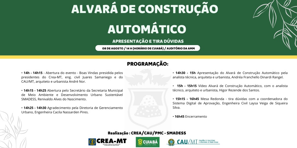 A Prefeitura de Cuiabá, por intermédio da Secretaria de Meio Ambiente e Desenvolvimento Urbano Sustentável (SMADESS), promove na tarde desta segunda-feira (8), a partir das 14h, uma apresentação especial sobre o Alvará Automático de Obras, no auditório da Associação Mato-grossense dos Municípios (AMM).