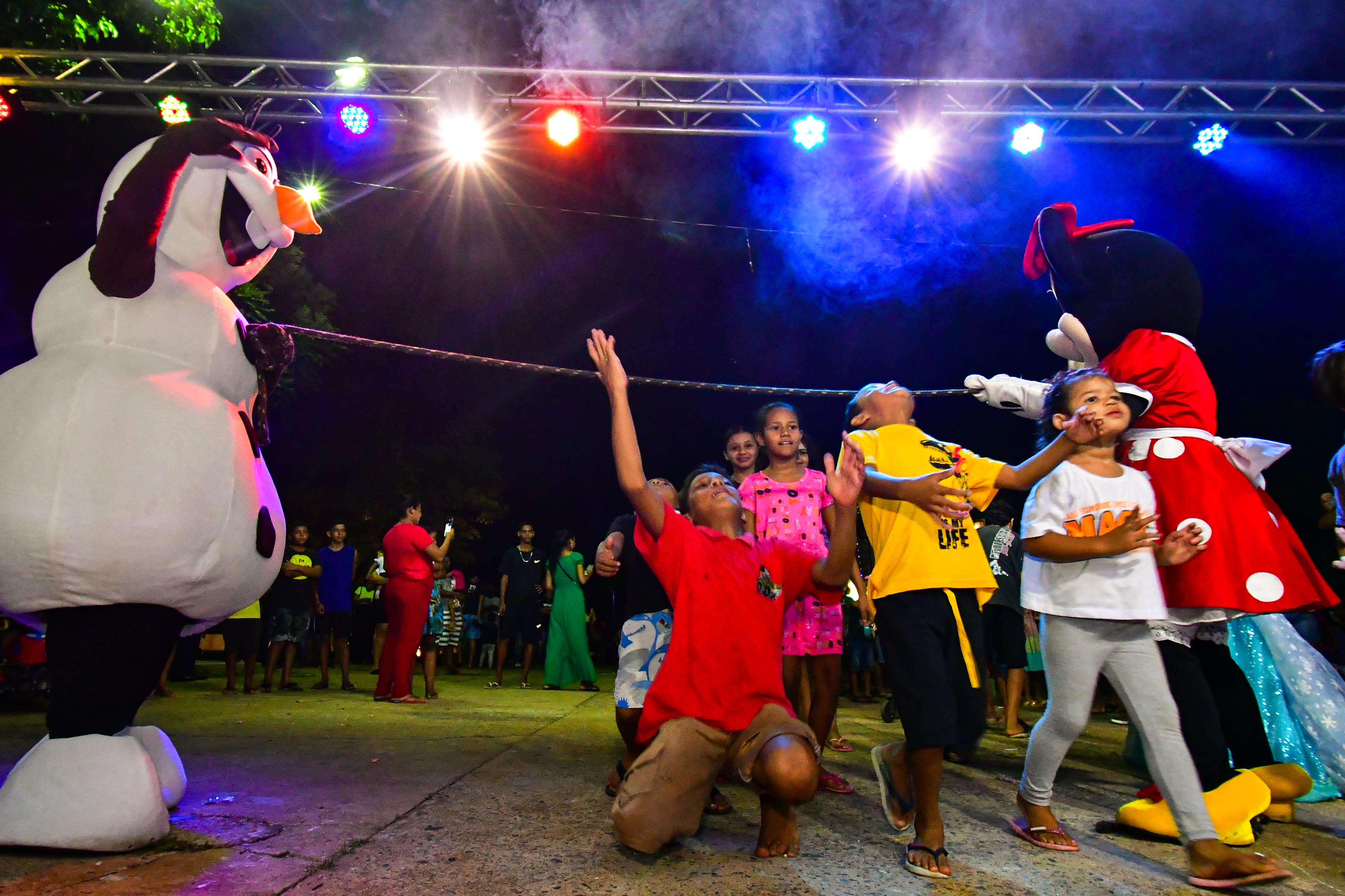 “O pessoal está gostando! Olha! Todo mundo está sorrindo, olha o meu menino dançando, ele não se solta assim não, é tímido, mas aqui ele está se divertindo, está feliz, agradece o prefeito Emanuel por mim!", comentou o morador Luiz Carlos, com os olhos brilhando enquanto filmava o filho Luiz Felipe, de 8 anos, participando da competição de dança comandada pela Elsa, personagem dos filmes Disney e que faz parte da Tia Hanna Produções, grupo que animou a criançada no 12º dia de Natal da Gente.