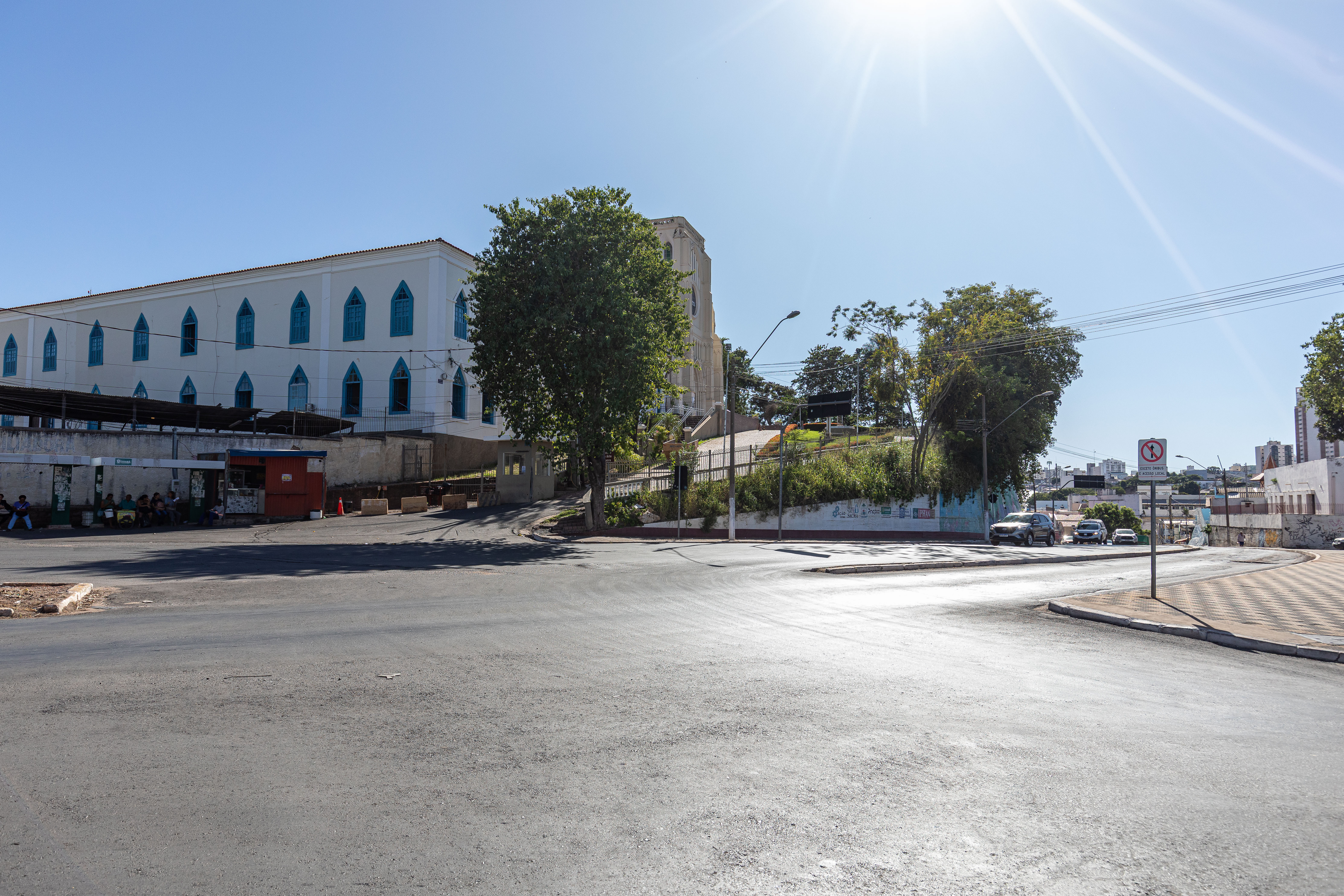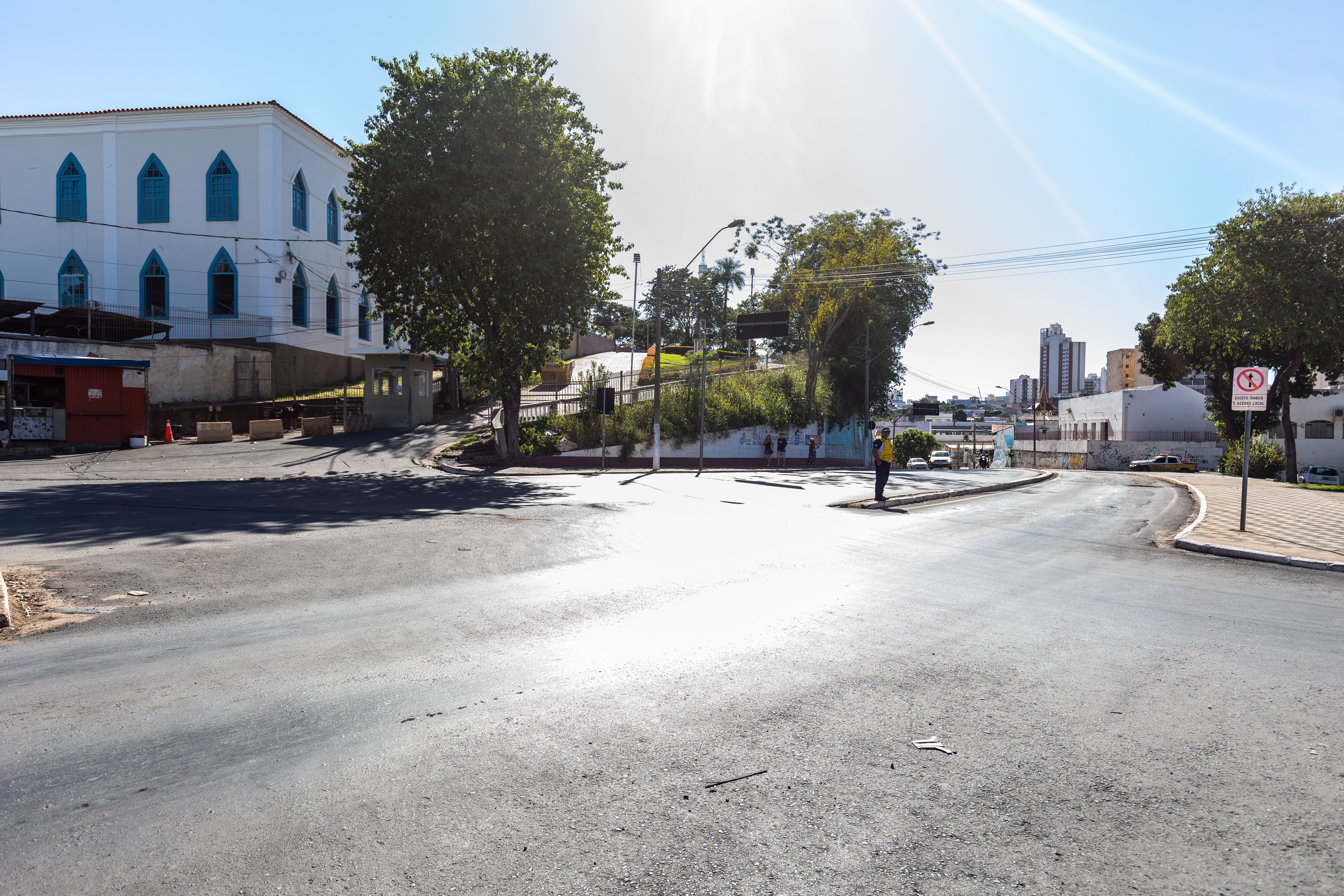 A foto mostra o local exato da Rua Coronel Peixoto que será interditado, incluindo a alça do retorno para quem sobe a Rua Clovi Hugueney. Ao fundo da imagem é possível ver a cidade e na lateral, a igreja Nossa Senhora do Bom Despacho, na Praça do Seminário.