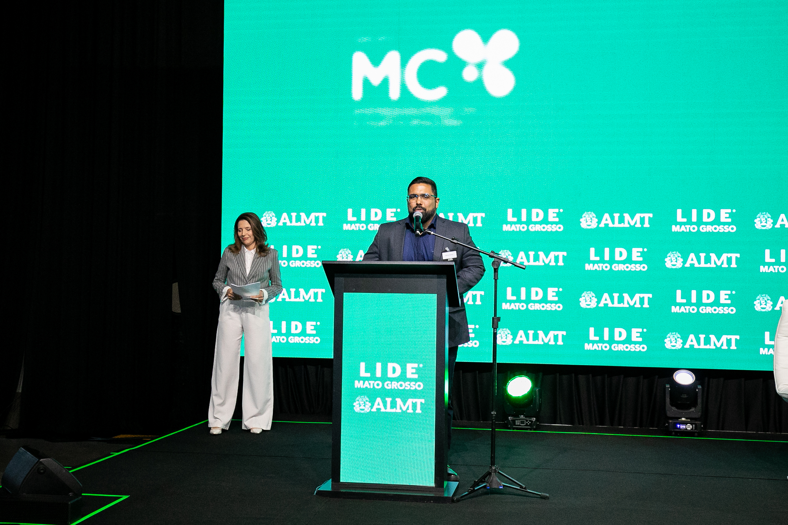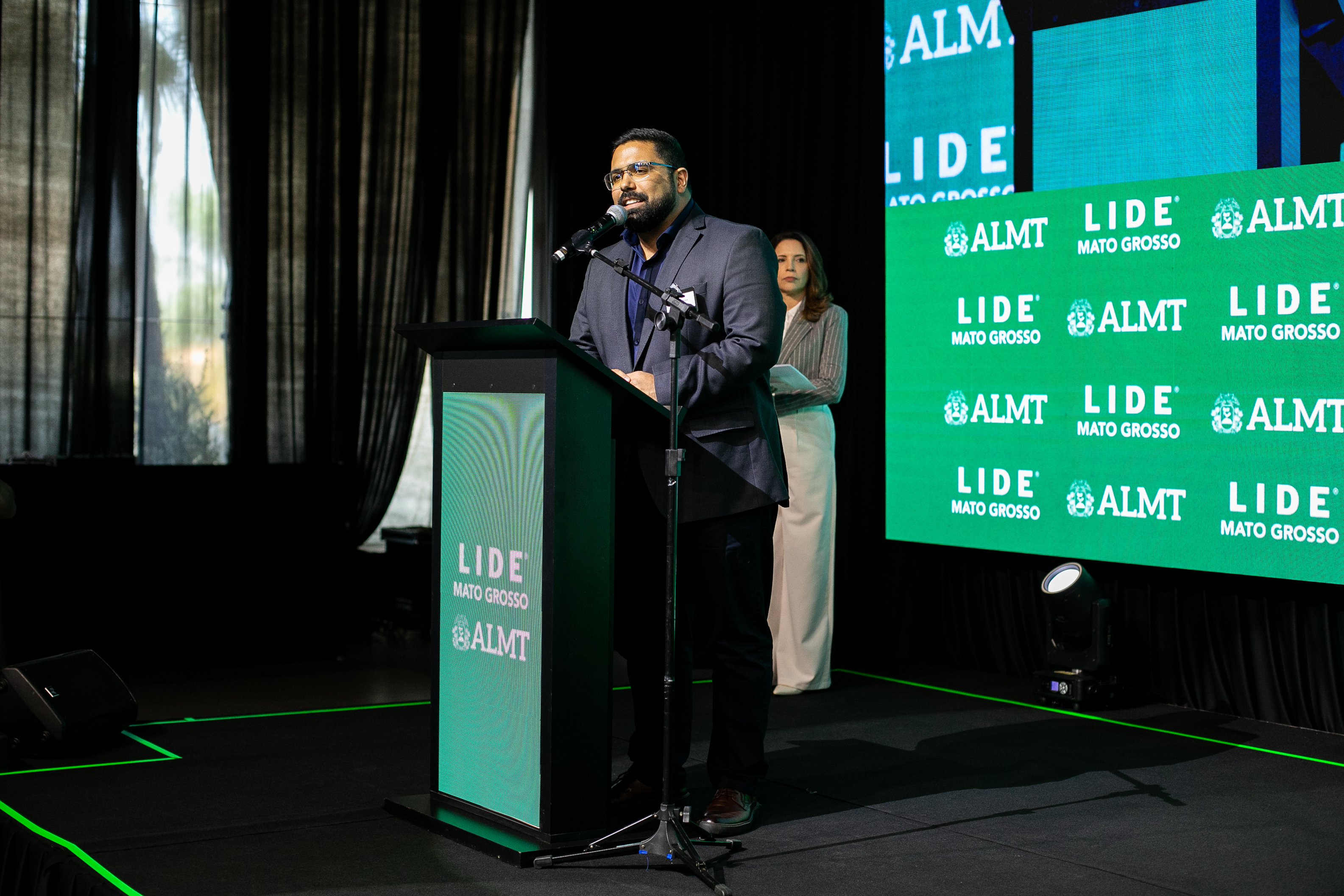 O secretário municipal de Turismo e Desenvolvimento Econômico, Fernando Medeiros, discursa durante o Fórum de Sustentabilidade e Desenvolvimento Econômico, promovido pelo LIDE Mato Grosso, em Cuiabá. Ao fundo, painel com a identidade visual do evento e da Assembleia Legislativa (ALMT)..