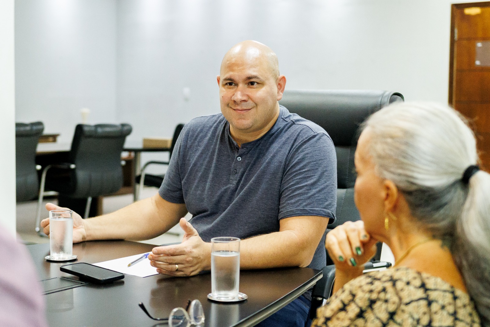 A imagem mostra o prefeito Abilio Brunini e a secretária de Saúde, Lúcia Helena, em reunião.