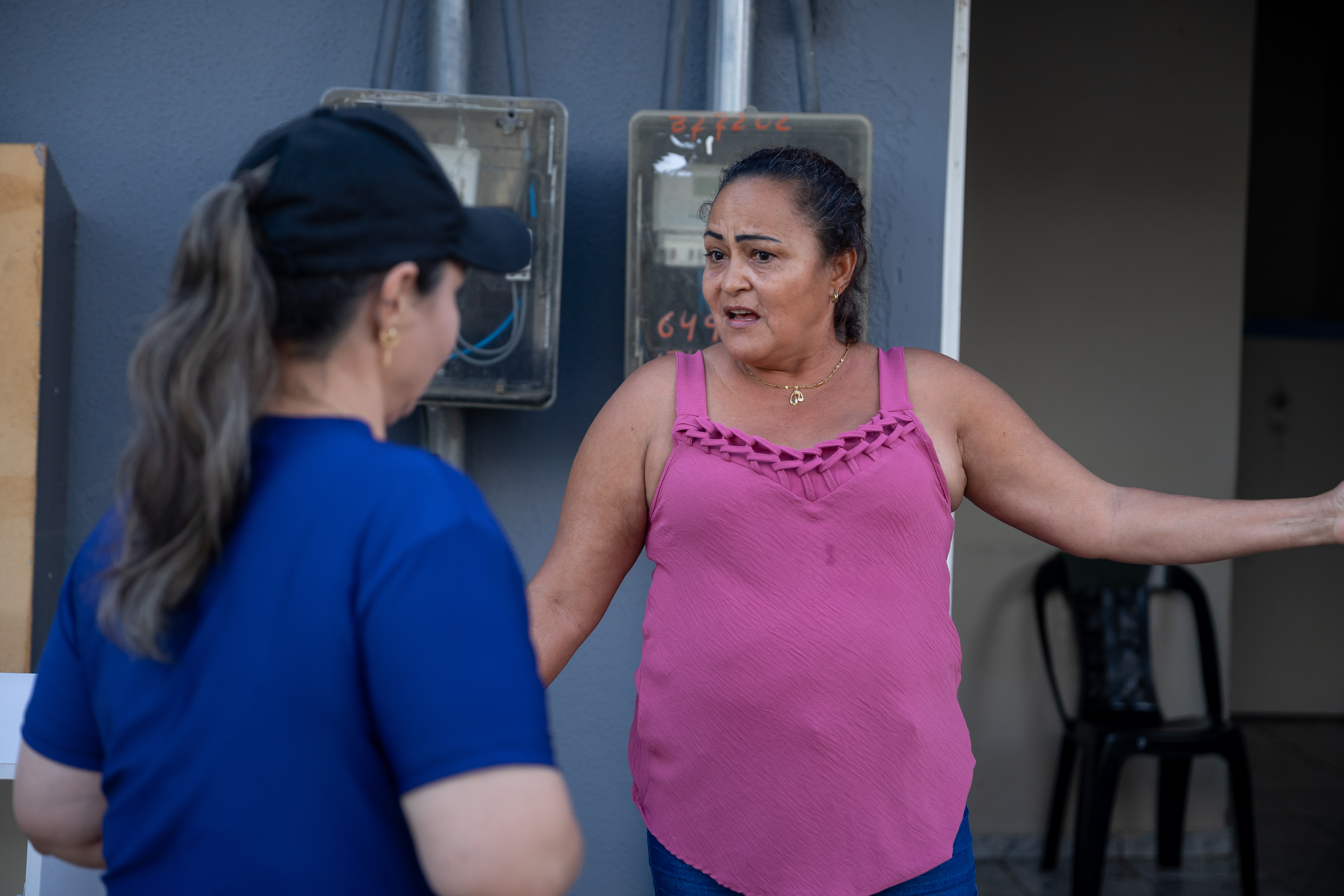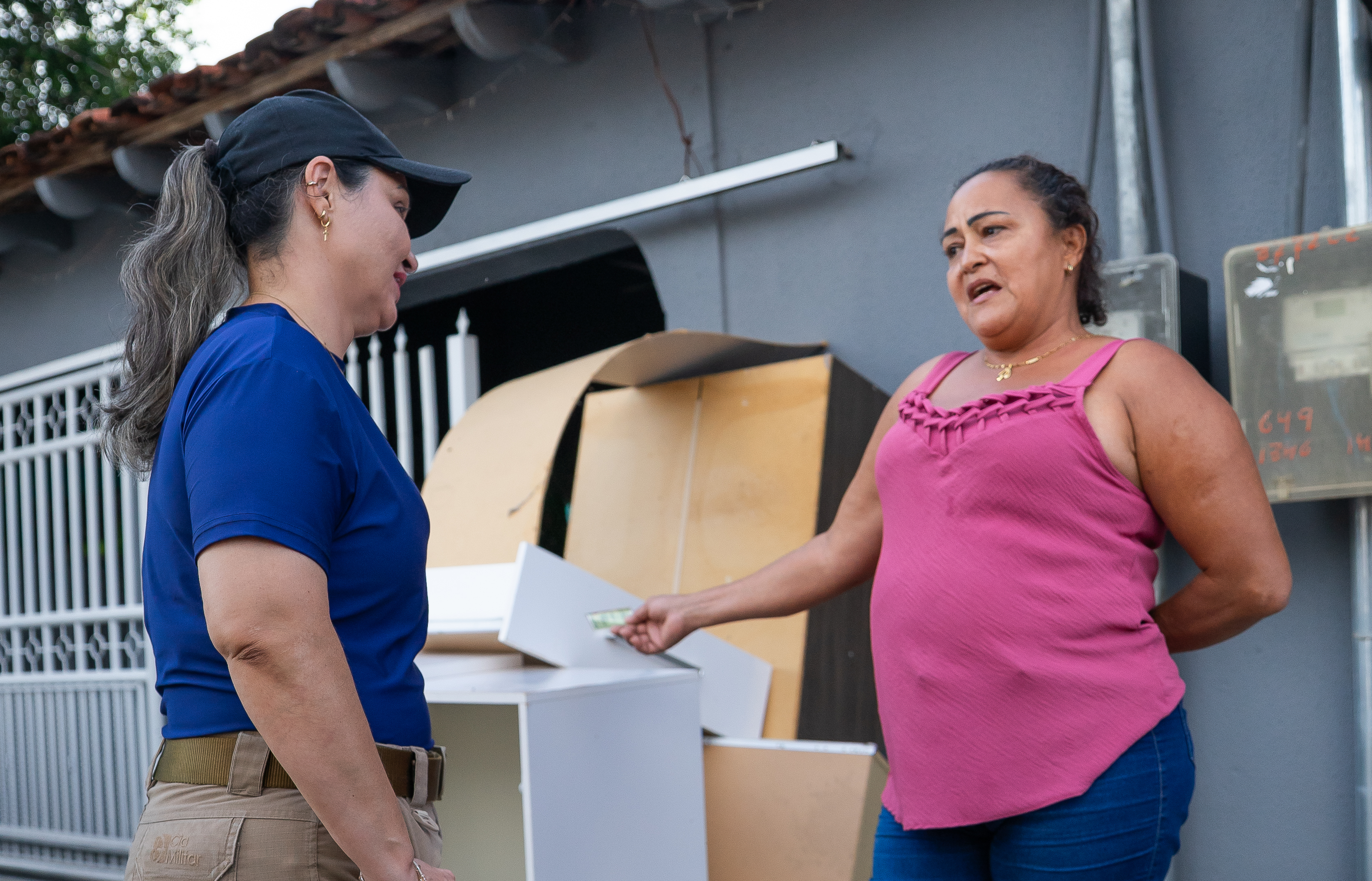 A imagem mostra a secretária de Assistência Social de Cuiabá, coronel Vânia Rosa, na residência de uma moradora atingida pelas chuvas no bairro Pedregal.