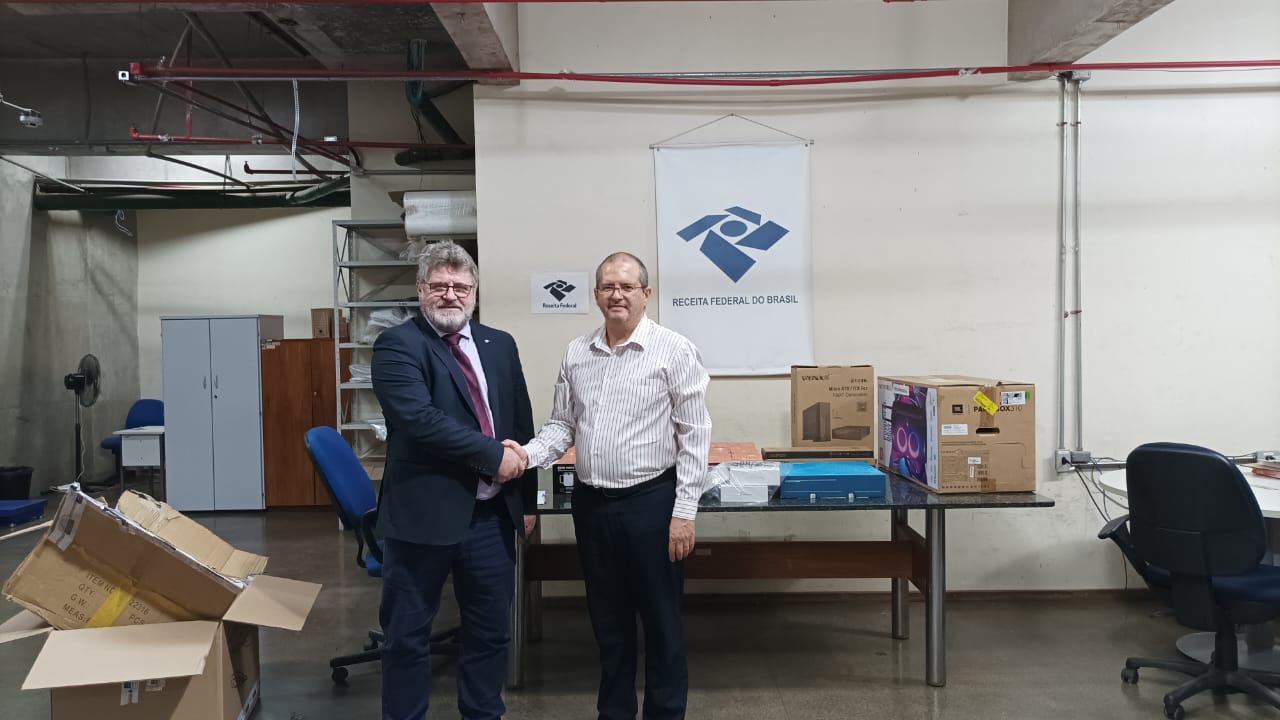 O Ministério da Fazenda, por meio da Secretaria de Receita Federal de Mato Grosso, realizou a doação de diversos equipamentos eletroeletrônicos à equipe da Vigilância Sanitária da Secretaria Municipal de Saúde de Cuiabá (SMS), na tarde desta quinta-feira (20). A entrega foi feita pelo Delegado da Receita Federal, Dr. Gelson José Schwendler, e recebida pelo pelo Coordenador da Vigilância Sanitária, Onofre Russo Filho.