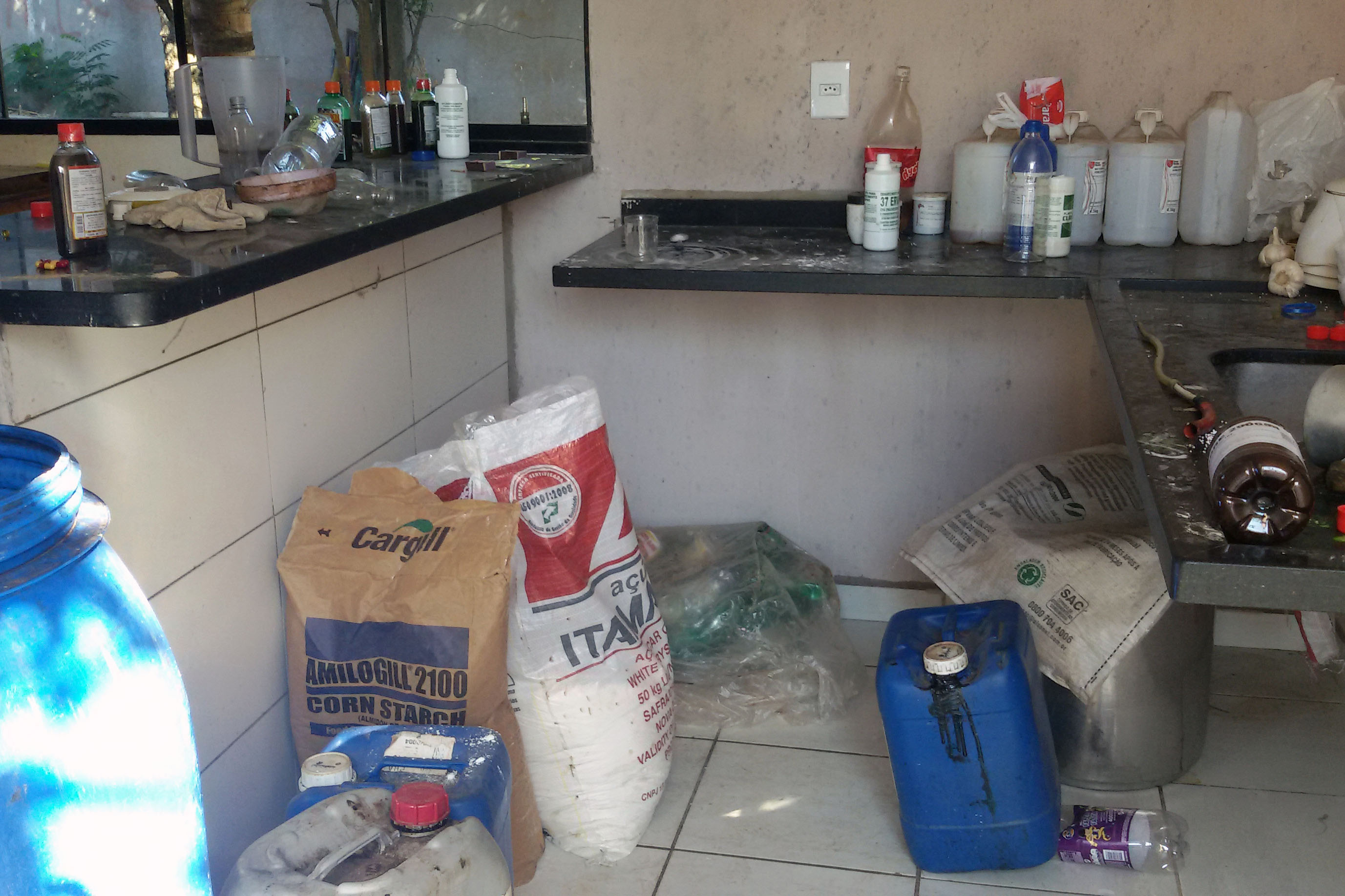 O preparo era feito em panelas de ferro e os suspeitos utilizavam uma barra de metal para misturar os produtos. Tudo feito ao ar livre no quintal da casa que não era cimentado, cheio de mato, sujeira e exposto ao sol, chuva e poeira. Depois disso eles abasteciam os recipientes com o auxílio de um funil que não era esterilizado.