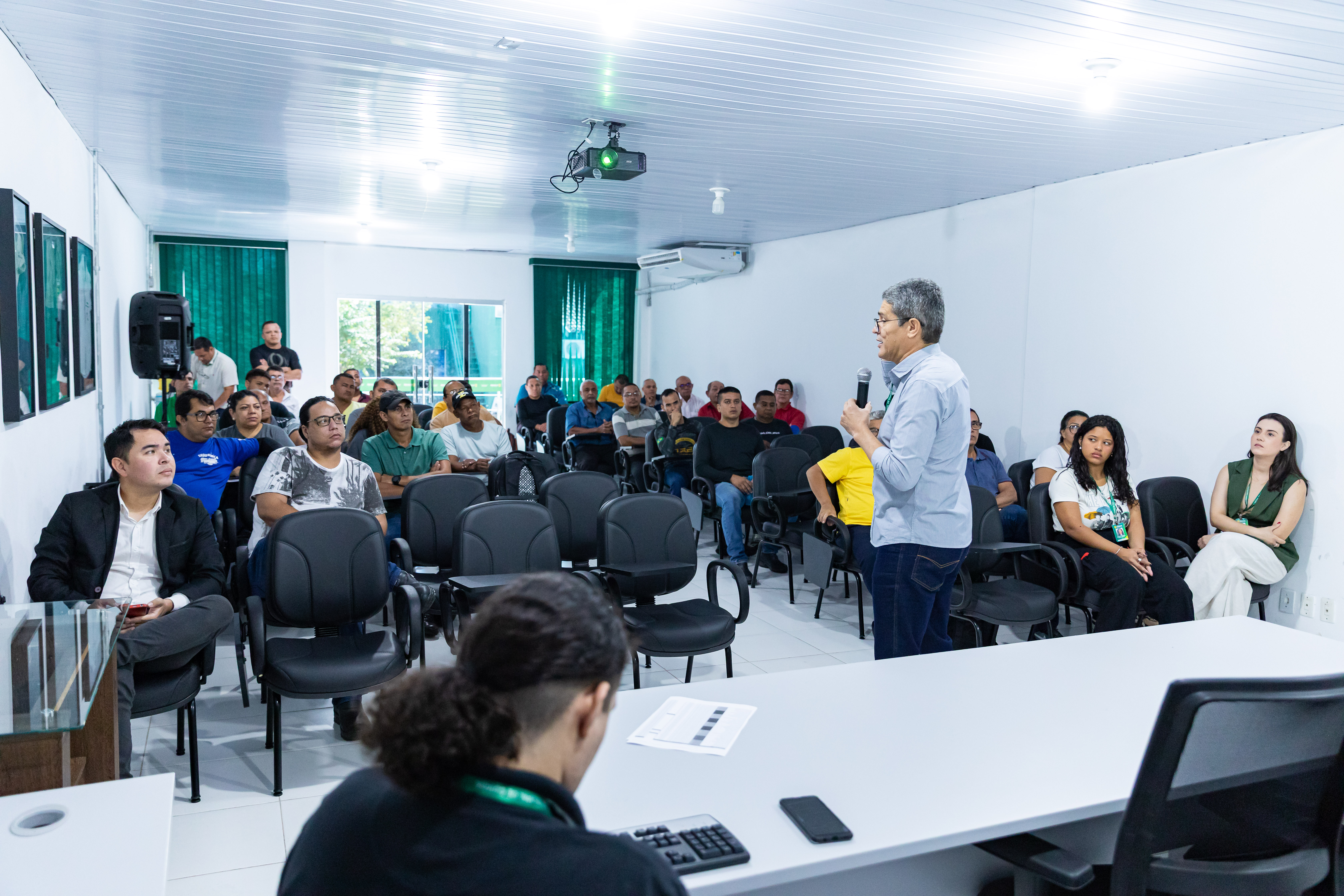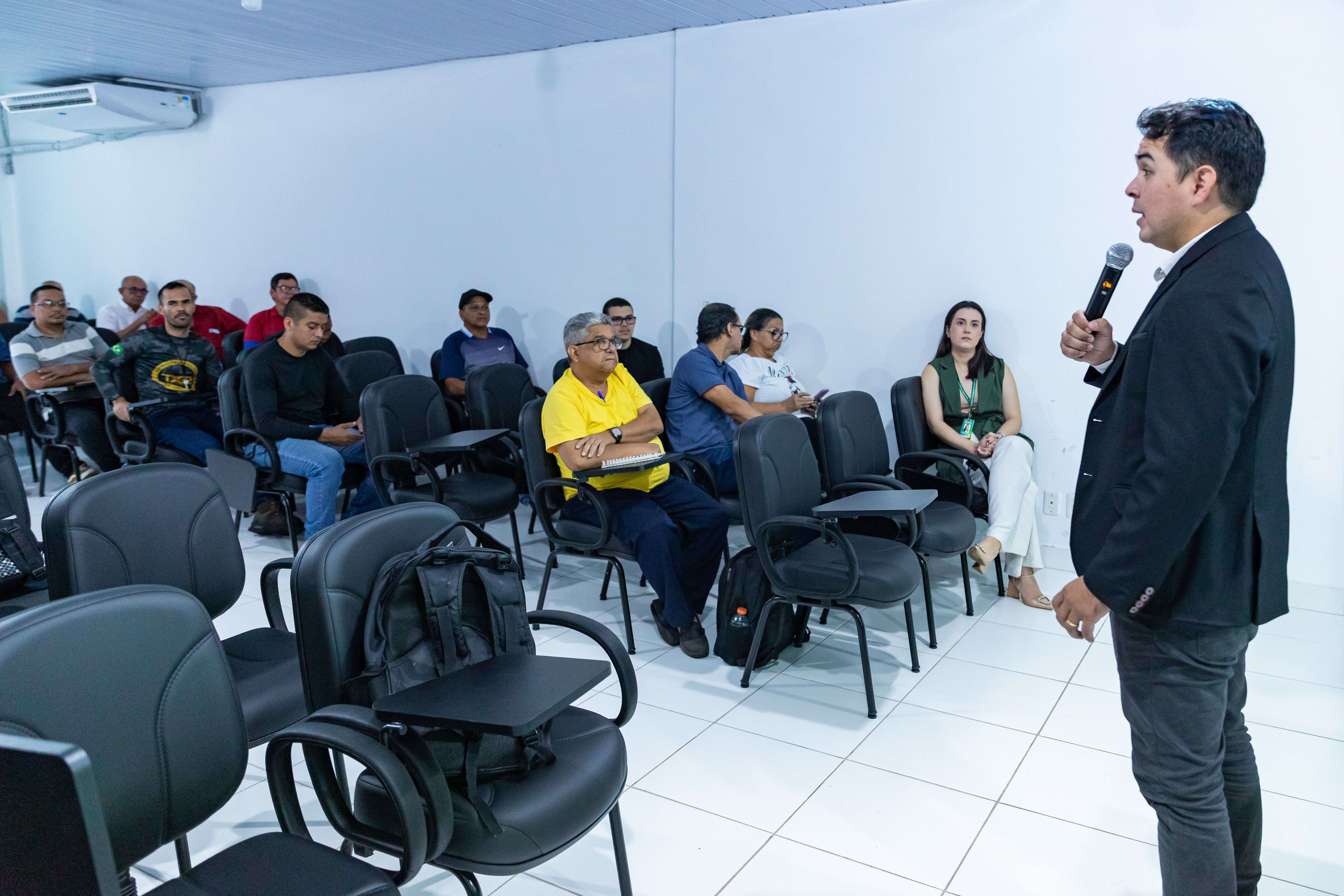 A imagem mostra pessoas sentadas em cadeiras prestando atenção numa palestra. Ao fundo, é exibido o palestrante vestido com trajes sociais e falando ao microfone.
