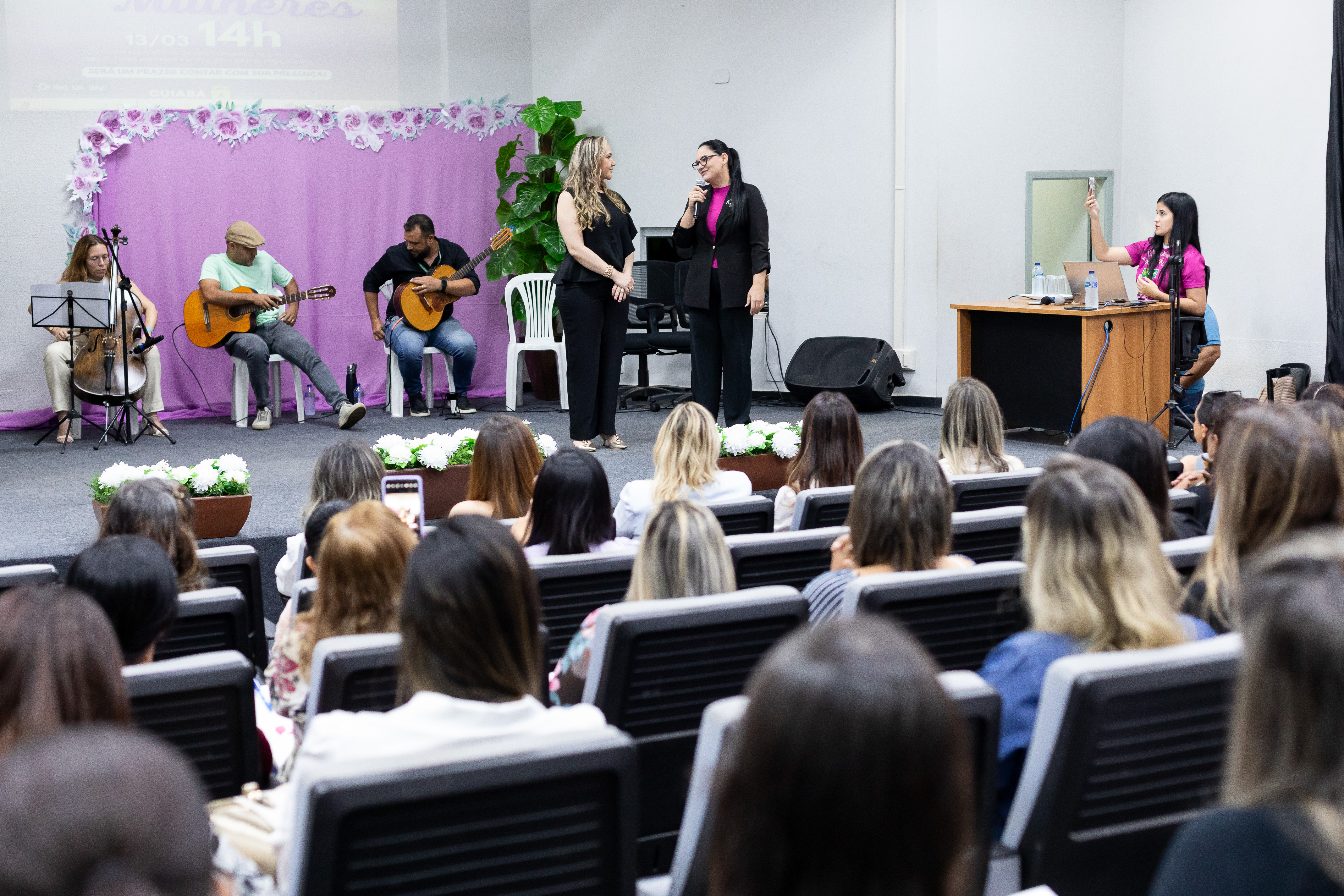 A imagem mostra as servidoras públicas no auditório da Secretaria Municipal de Educação. Ao fundo, tem um palco onde aparece a secretária da Mulher, Hadassah Suzannah. Abaixo temos uma galeria de fotos que registra diversos momentos do Workshop para Mulheres.