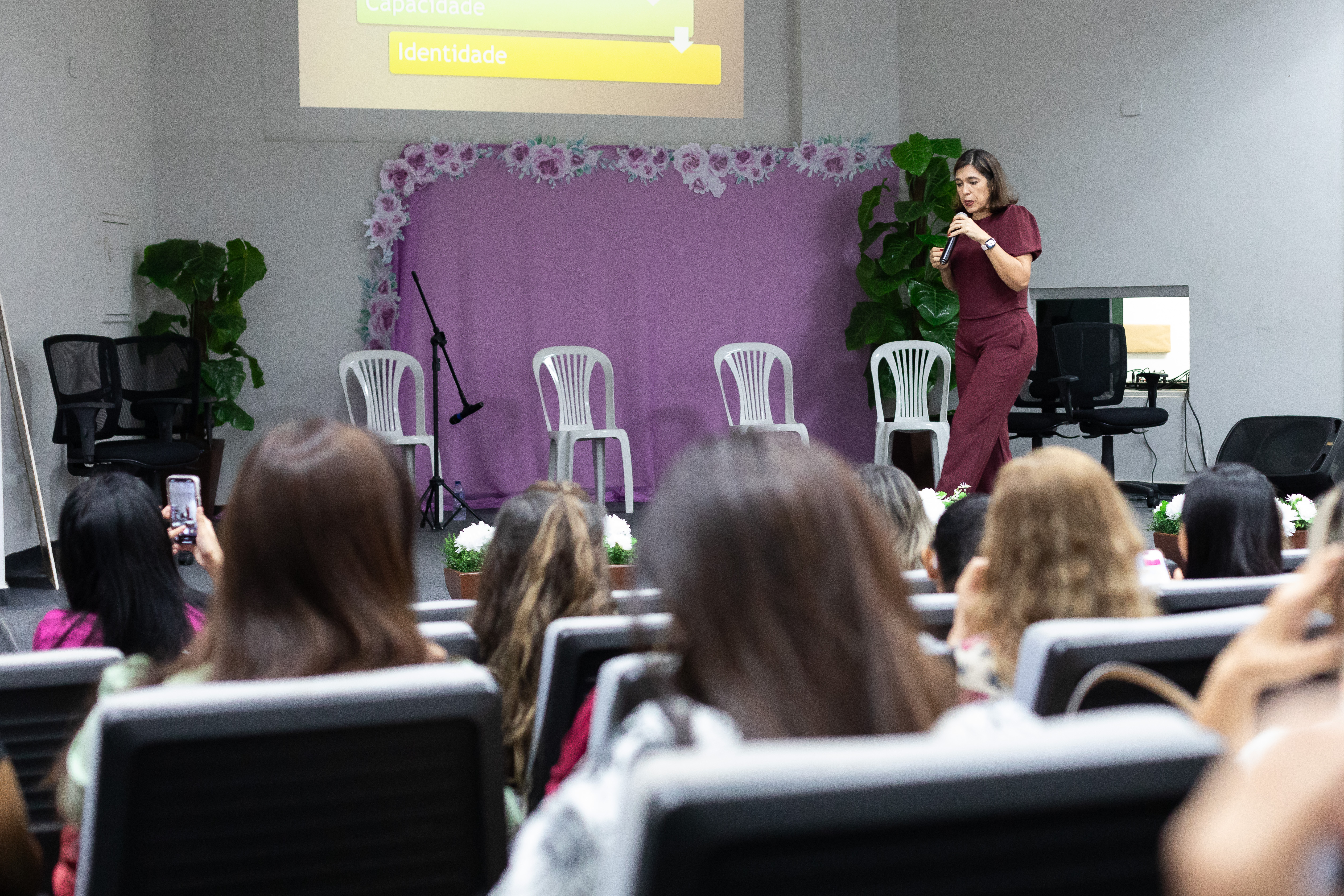 A jornalista e consultora Ana Paula Fortes conduziu uma palestra sobre posicionamento e comunicação, com foco na imagem da mulher de valor. Ela destacou a importância de refletir sobre a mensagem que cada mulher transmite em diferentes ambientes.